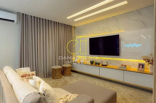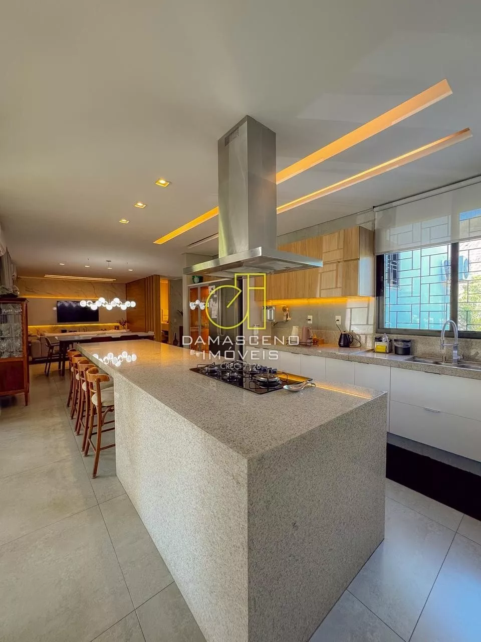 🎬Sala de TV integrada à cozinha em conceito aberto, unindo funcionalidade e convivência;
